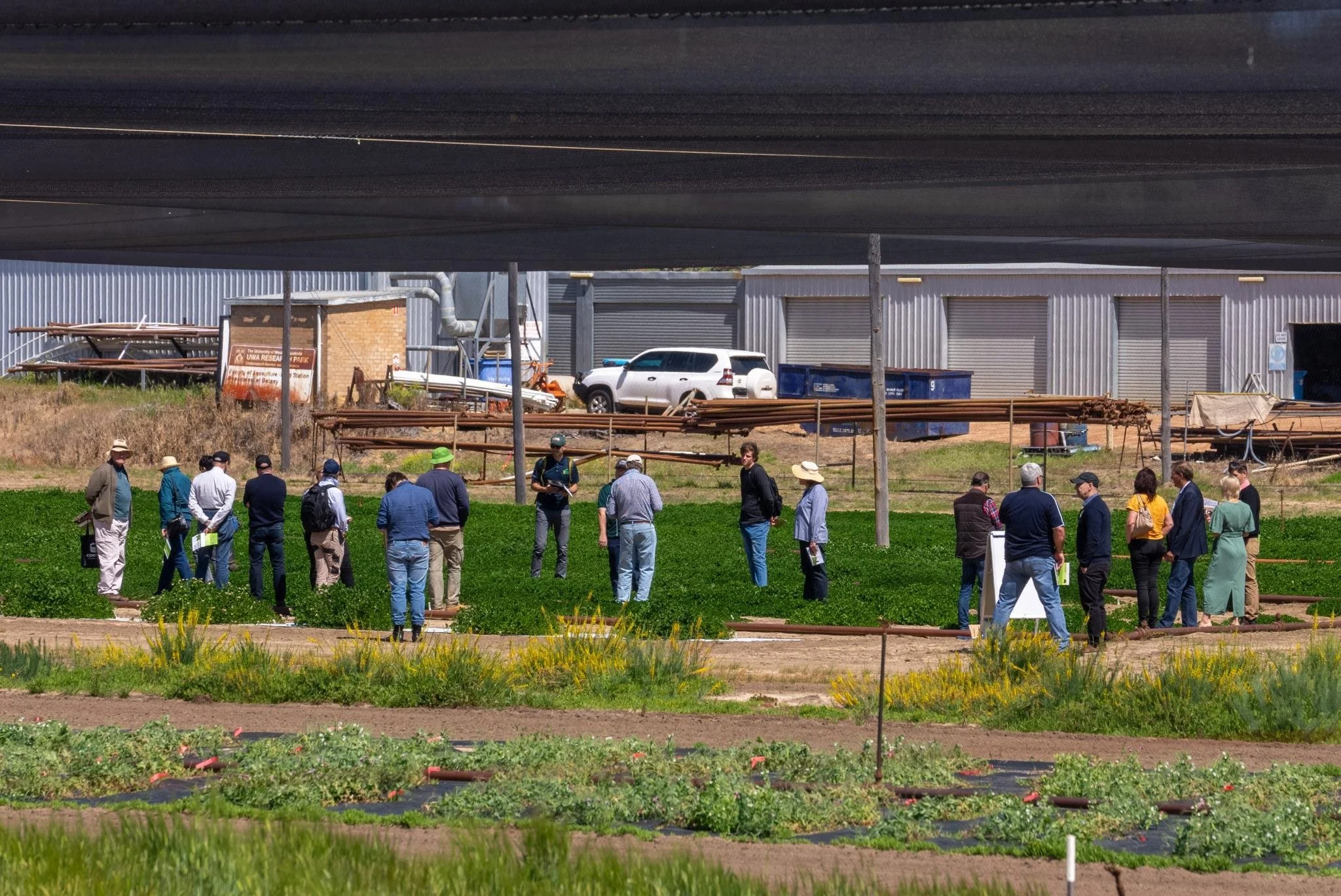 Associate Professor Phillip Nichols and Senior Research Officer Brad Wintle discuss the latest research on breeding and selection of legumes in one of the UWA Field Facility covered test paddocks.