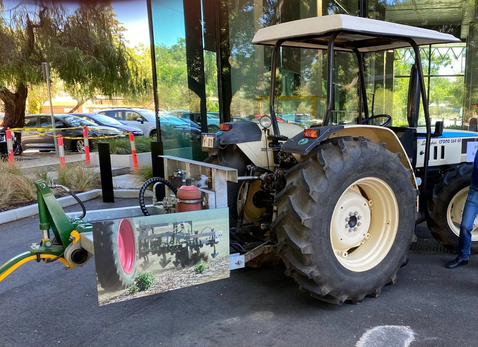 In addition to information and images showing the Centre’s R&D, a functional Seed Flaming device and Weed Chipper 3pt linkage module connect to the University’s Lamborghini tractor were on display.